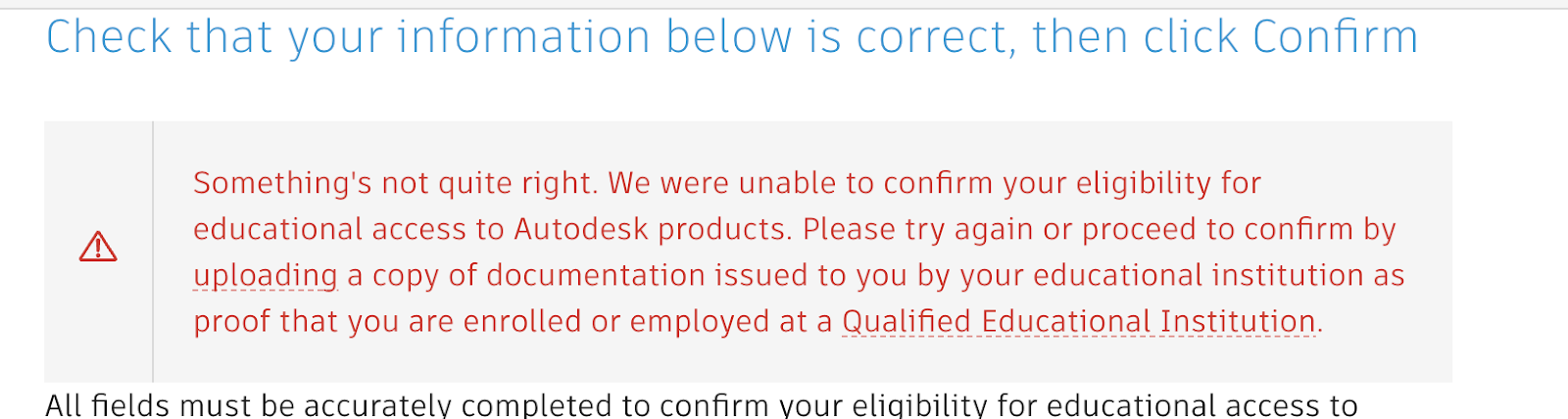 - If Autodesk cannot automatically confirm your student status they may ask you to upload a copy of your student id or a confirmation letter or a transcript