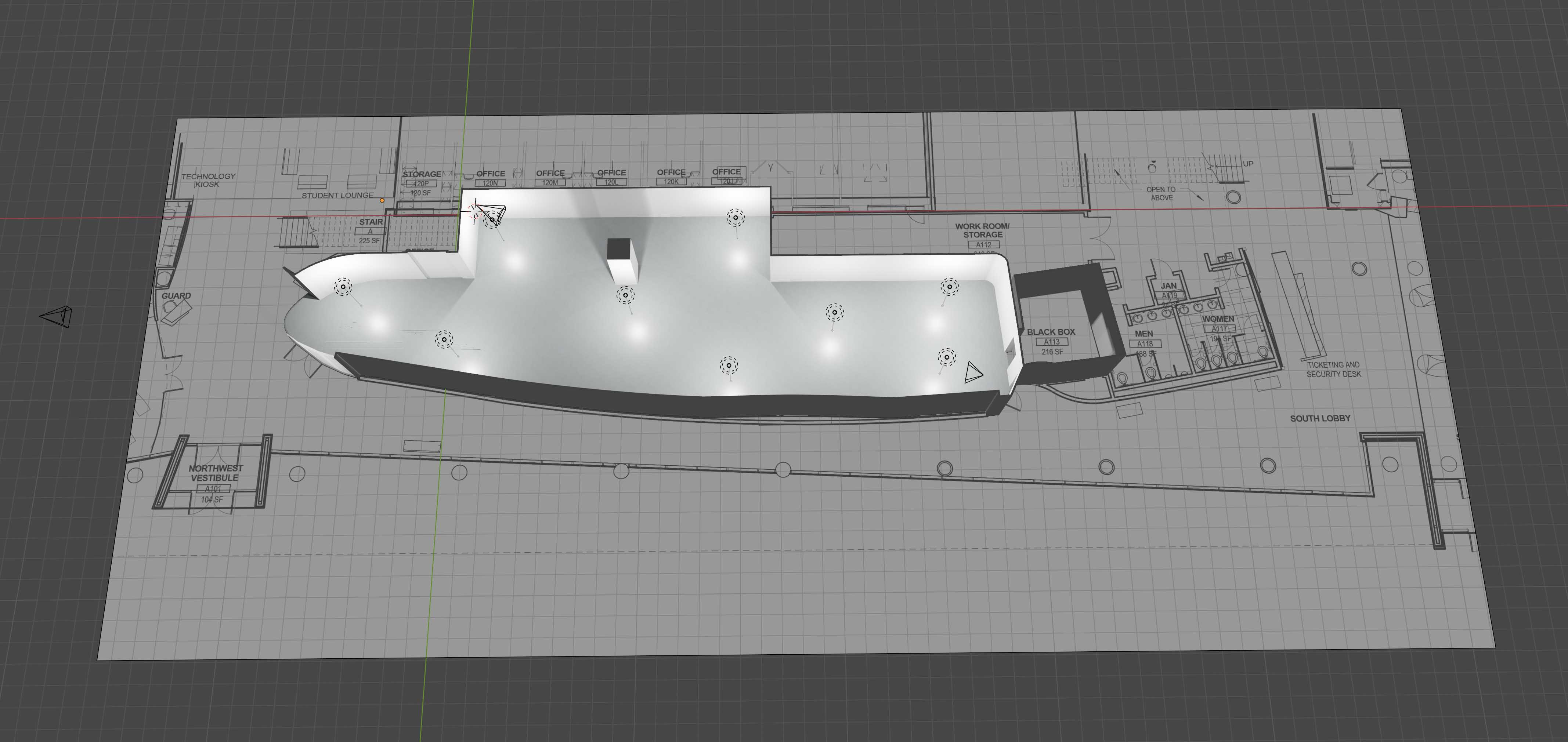 Example of a basic prebuilt model of the gallery ready for ideation and visualization. Link to Blender file