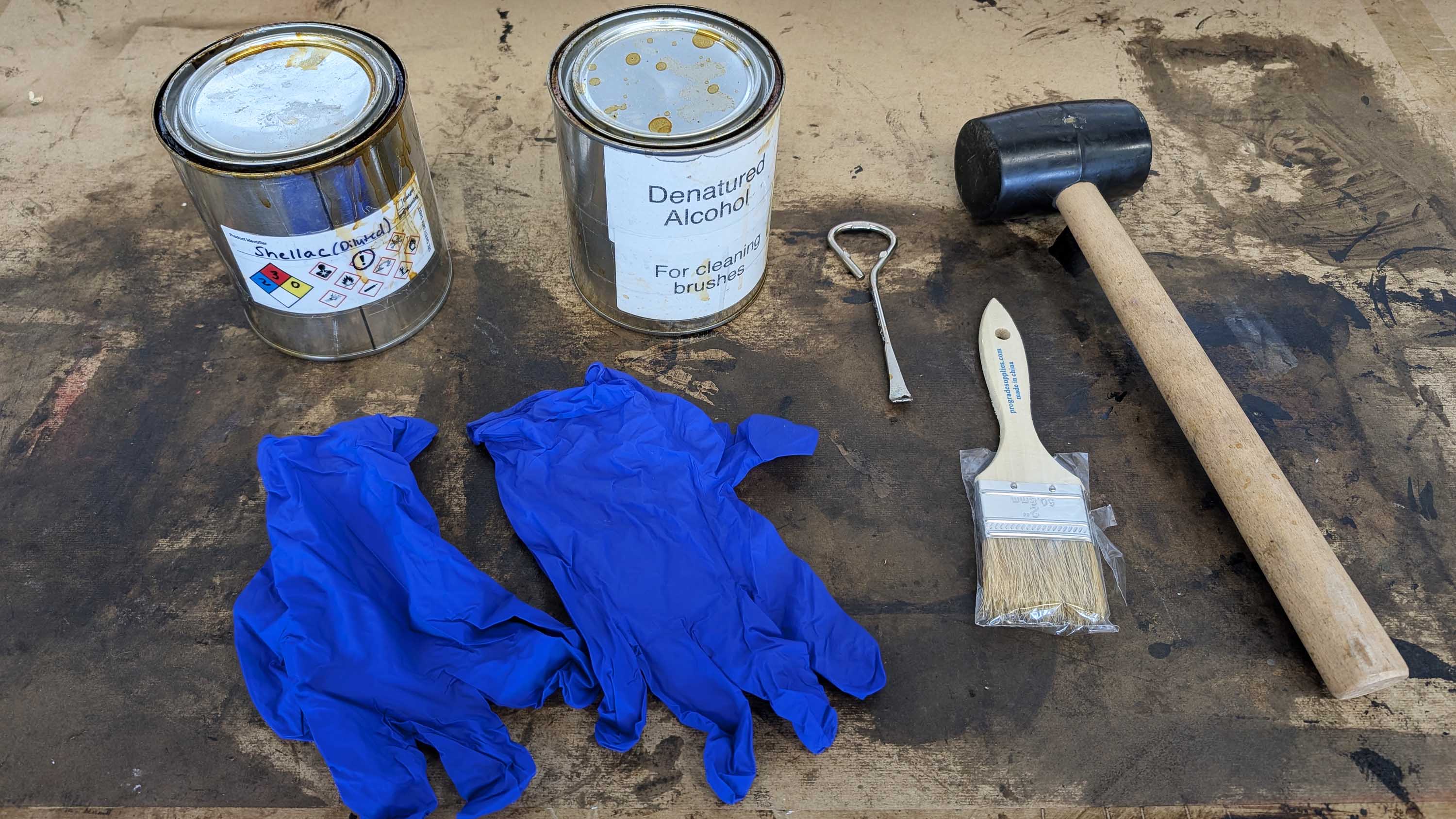 Printmaking Shellac Sealing Tools, (Diluted Shellac, Denatured Alcohol, Can Opener, Brush, Rubber Mallet, Nitrile Gloves)