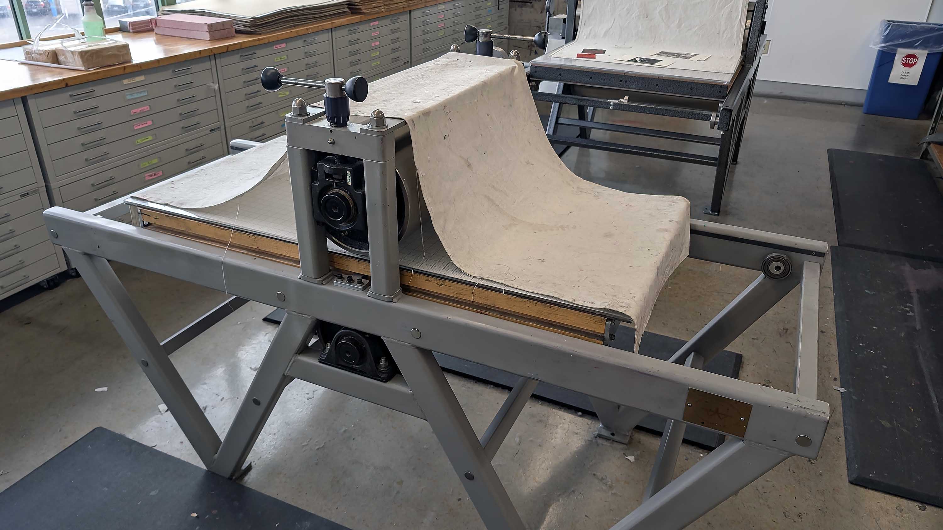 - Note: The Takach Etching Press is always engaged with the wheel and the mobile press #2 is not automatically engaged and may need to be “assisted” when you start to turn the wheel. Be aware of what is going toward the press and avoid allowing anything but the print pass through the press. Be aware of where your hands and clothing are. Be safe.